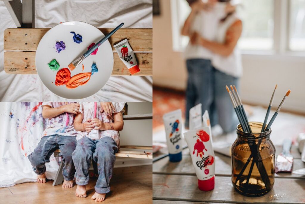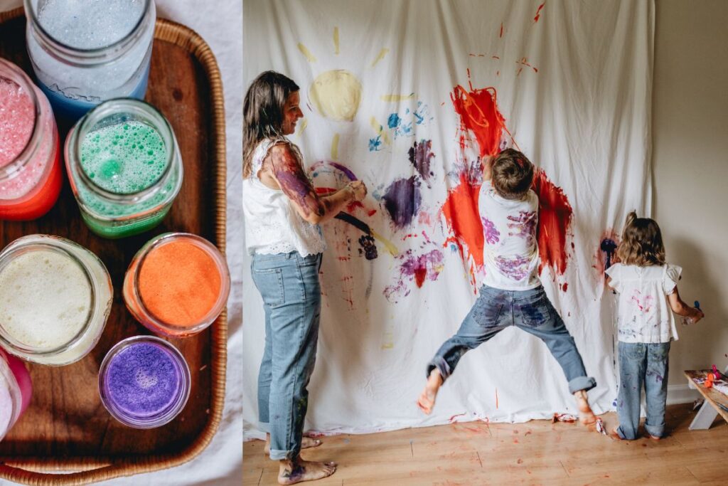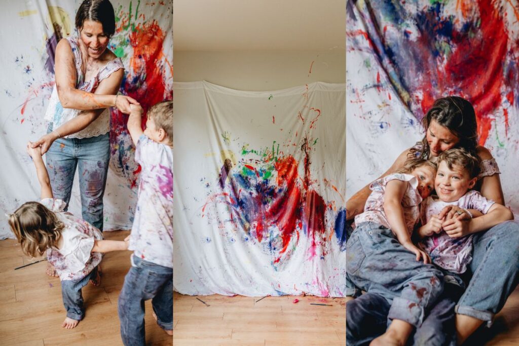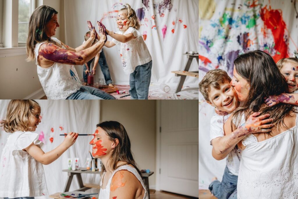 Recently, I photographed an outdoor, turned indoor at-home session where my client taped a sheet to the wall, pulled out paint, and let her kids go wild. Bare feet. Paint-covered hands and faces. Laughter, chaos, and color everywhere.